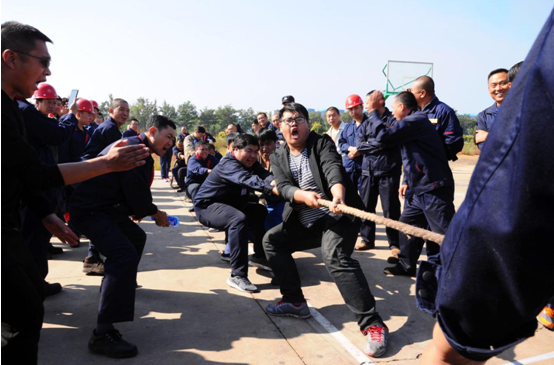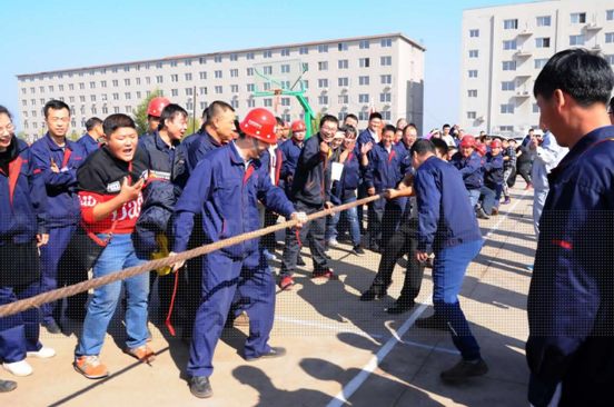 比賽場地設(shè)在辦公樓門前停車場。由各車間為單位,組成的12支代表隊參加了比賽,其中男隊8支女隊4支。比賽采用三局二勝制淘汰賽,每隊參賽人員 10人,按抽簽分組決定比賽順序。參賽隊員們個個摩拳擦掌、士氣高昂,隨著裁判員一聲哨響,比賽正式開始。隊與隊之間是一場力量和技術(shù)的較量,上場的兩支參賽隊伍緊握拔河繩,心往一處想,勁往一處使,拼勁全力,展開了實力拉鋸戰(zhàn)。賽場下,啦啦隊員們?yōu)樽约褐С值年犖榧佑凸膭牛曇焕烁哌^一浪。隊員們在賽場上的精彩表現(xiàn)搏得了現(xiàn)場觀眾的陣陣歡呼,號子聲、吶喊聲,此起彼伏,高潮迭起,氣氛熱烈。