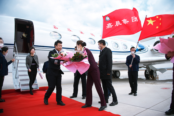 接機儀式上,嘉晨集團董事長孫壽寬致辭。嘉晨集團是我市本土成長起來的全國知名500強企業。創新能力強,發展潛力大,產品質量好,近年來,無論鐵礦石、原煤等原材料的進口,還是“超純鎂砂”高科技產品的出口,僅每年國際貿易所產生的經濟價值已遠遠超越飛機價值本身。孫壽寬表示,在社會需要的特殊時期,作為本地民營企業,飛機也可以第一時間用于支持火線馳援等,為全社會提供更多力所能及的幫助。