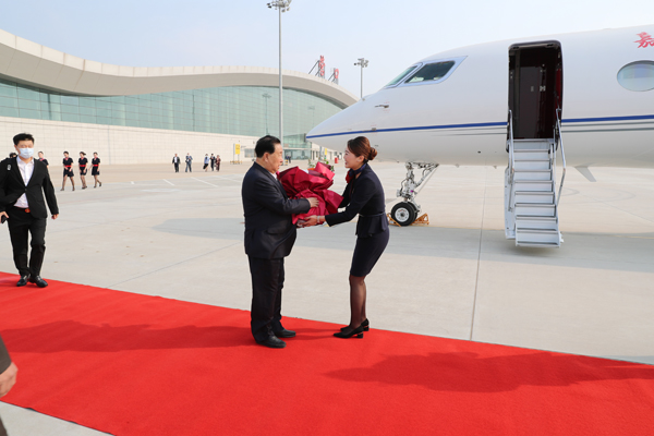 4月30日7時30分,嘉晨集團董事長孫壽寬先生及隨行人員乘車抵達營口蘭旗機場,開啟了嘉晨集團首架公務機(灣流650型)首航之旅。在完成安檢流程后,孫壽寬董事長一行緩步走向停機坪,機組人員向董事長及隨行人員親切握手,敬獻鮮花并合影留念。8時飛機準時起飛。此次飛行將在一天內抵達中國東部及南部多座城市,以公務機的靈活便捷優勢為嘉晨集團業務版圖擴展提供強大動力。